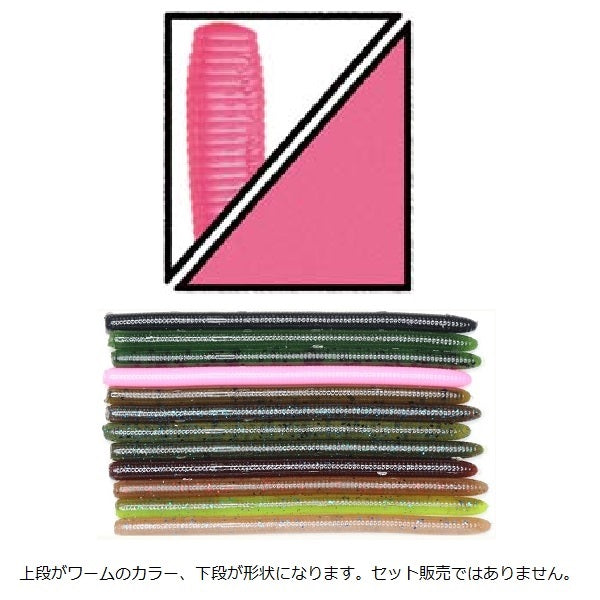 This non-tapered worm has no tapered body, so when used with a drop-shot wacky rig, the action applied at the hook point is transmitted firmly as it rolls all the way to the head and tail.
