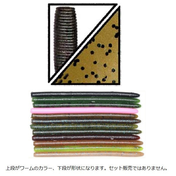 This non-tapered worm has no tapered body, so when used with a drop-shot wacky rig, the action applied at the hook point is transmitted firmly as it rolls all the way to the head and tail.