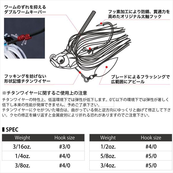 A blade connected to shape memory titanium wire is attached to the bottom of the head, and the flashing and wave action appeals to bass over a wide range even in poor visibility such as in weed jungles.