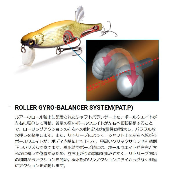 The Anthrax is a wake bait with a roller gyro balancer system (PAT.P), which allows the ball weight to shift on the shaft balancer, creating a high-pitched clicking sound and a variety of multi-actions.