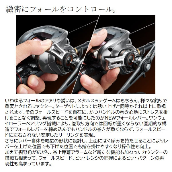 Equipped with a new fall lever that is equipped with a one-way roller bearing and prevents the steering wheel from becoming heavy even when the brakes are applied. For cutlass fish, floater, one tenya fishing, Tairaba fishing, SLJ (slow light jigging), etc. where slow fall invitation is effective, it enables a wide range of precise fall speed adjustment without spoiling winding comfort.