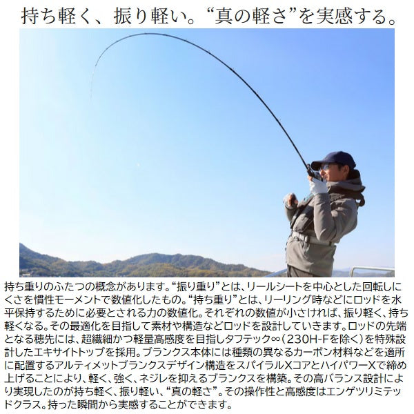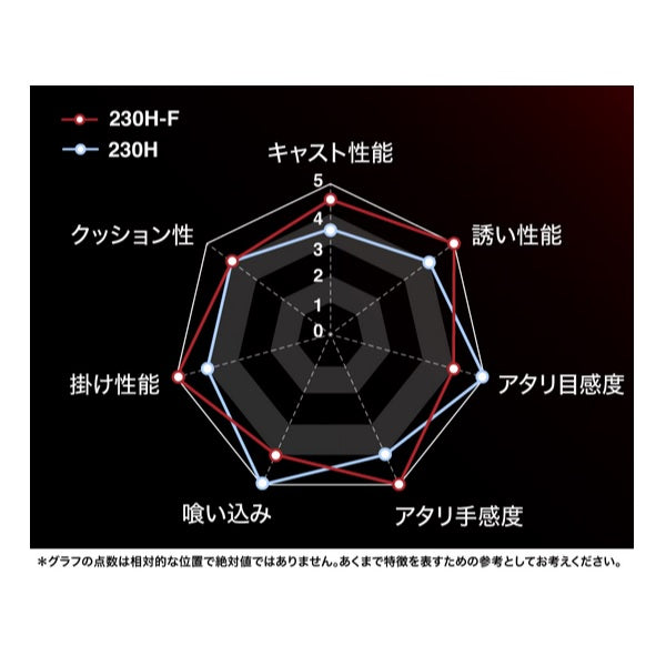 ■230H-F....This is a super high response model that attracts fish with a good tempo, rhythmic and sharp operation, and pursues immediate hooking performance with no time lag.